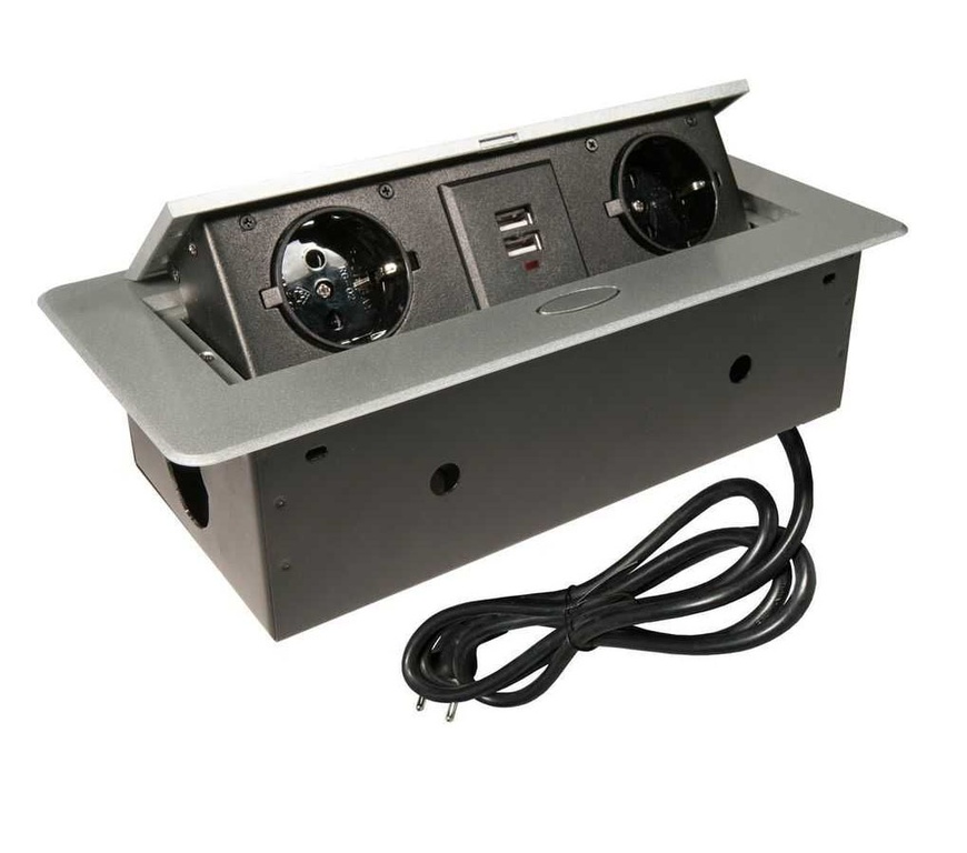 11.106.05.012 Блок розеток выдвижной горизонт, 2 розет, 2USBх2.1А, 250В, max 2700Вт, каб 2м, СЕРЕБРО