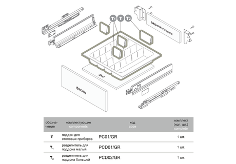 Мебельная фурнитура Фурнитура Blum Мойки кухонные ЛДСП / МДФ Столешницы и комплектующие Акриловый камень Grandex Внутреннее наполнение для кухни Компакт-плита HPL Профиль Алюминиевый PREMIAL Ручка профиль GOLA Бытовая техника Опоры и подстолье Комплектующие для шкафов Цокольные системы Система Joker Электрика Универсальная фурнитура Мерч и Образцы Прочие механизмы Матрасы ортопедические (под заказ) Каркасная мебель Loft0Разделитель для поддона малый, цвет серый ВЫВОДХарактеристикиОписаниеАртикул 10943Артикул поставщика PCD01/GRБазовая единица штРазделитель для поддона малый – это небольшая перегородка, с помощью которой пространство узких лотков поддона можно дополнительно разделить на ячейки нужных размеров. Установить разделители легко и просто: на стенках лотка поддона предусмотрены специальные риски для надежного совмещения с разделителем. Благодаря разделителям внутреннее пространство поддона организовано наиболее удобным для конкретного пользователя образом.(аналог 56464)