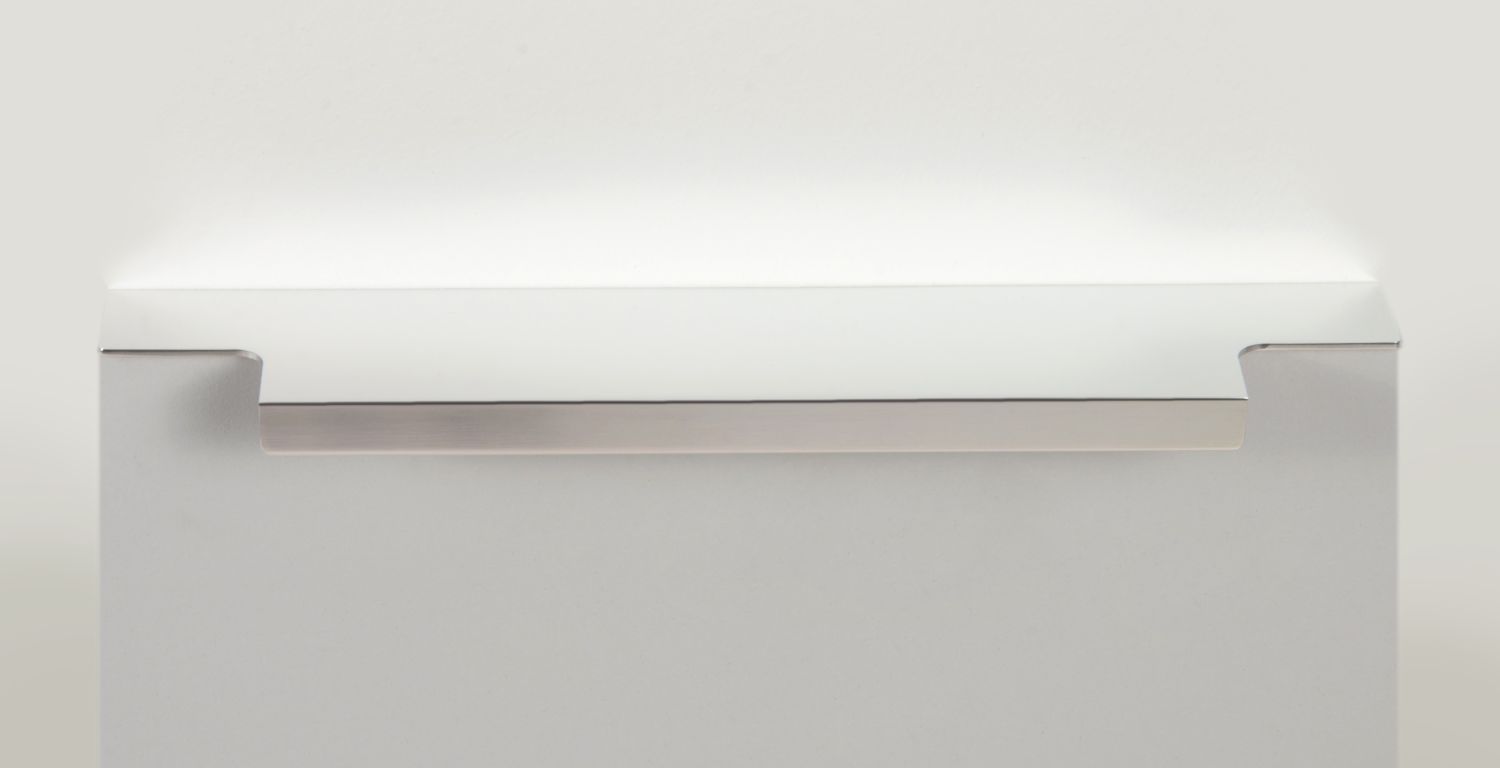 Ручка имеет богатую палитру цветовых решений и разнообразие длин. В зависимости от длины, модель допускает размещение двумя способами — «в размер» фасада и по центру широких фасадов (как большой «язычок»).